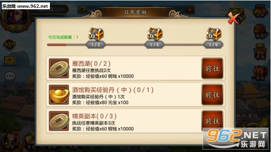一天下来总共能拿到740点经验、50000铜钱和500元宝!另外,每完成3个任务就能打开一个每日宝箱,里面也有你在