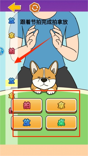 在模式选择界面里,“拍拿放”选项旁设有节奏图标标识,选中该选项后系统将自动播放示范动画。