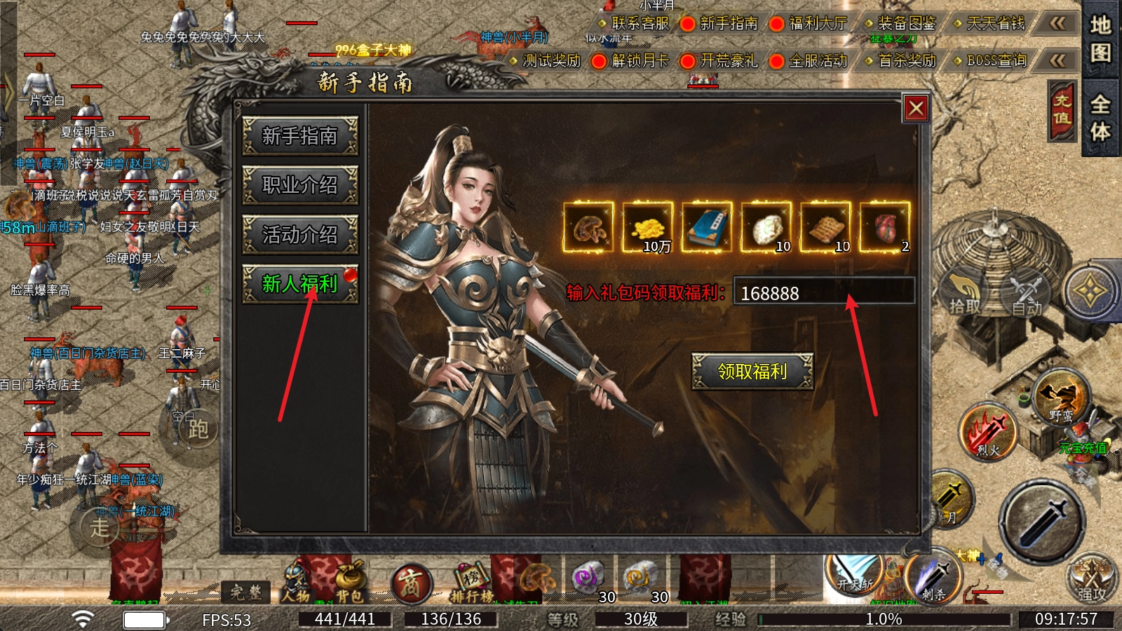 兑换方式:先点击上方的新手指南,接着找到新人福利入口,最后在对应的输入框内输入礼包码就行。