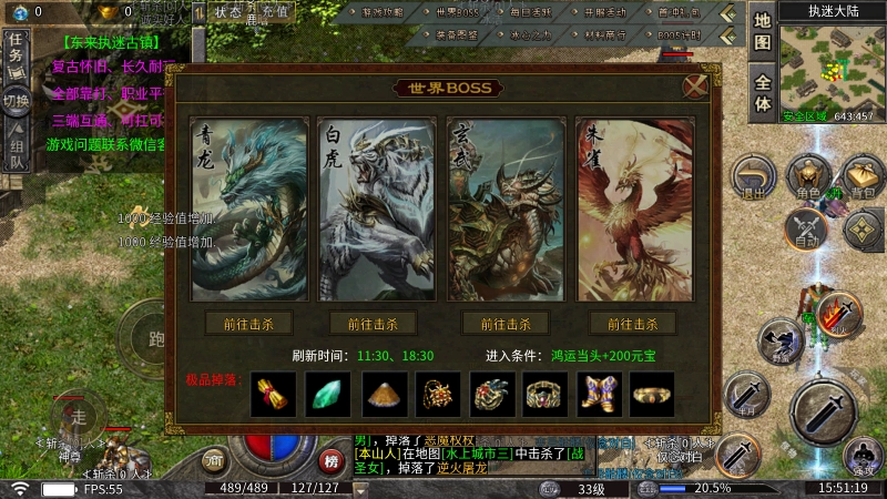 青龙、白虎、玄武、朱雀这四大神兽BOSS正等待你的挑战,每日11:30与18:30会准时刷新,丰厚的极品奖励也将随你击败BOSS而爆出。