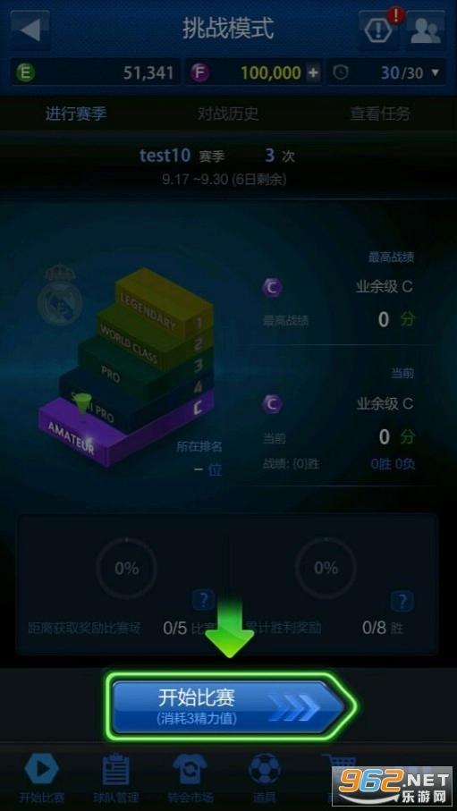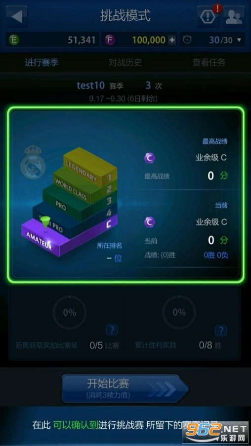 进入挑战模式界面后,会呈现当前的挑战模式积分以及球队的相关信息。