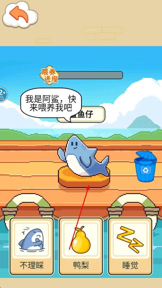 进入《养只小鲨鱼》这款游戏,领养你的第一只小鲨鱼,接着按照游戏提示为它挑选初始的喂食种类,从而开启这段像素风格的宠物养成旅程。
