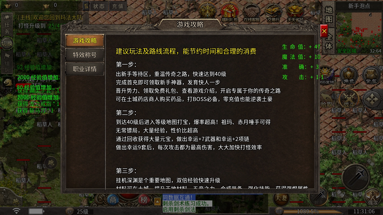 提升势力等级、领取免费福利礼包、了解游戏详情,开启独属于你的传奇征程。你可以在土城的药店商人处购买药品,这是挑战BOSS的必备物资,即使不充值也能逆袭成为强者。