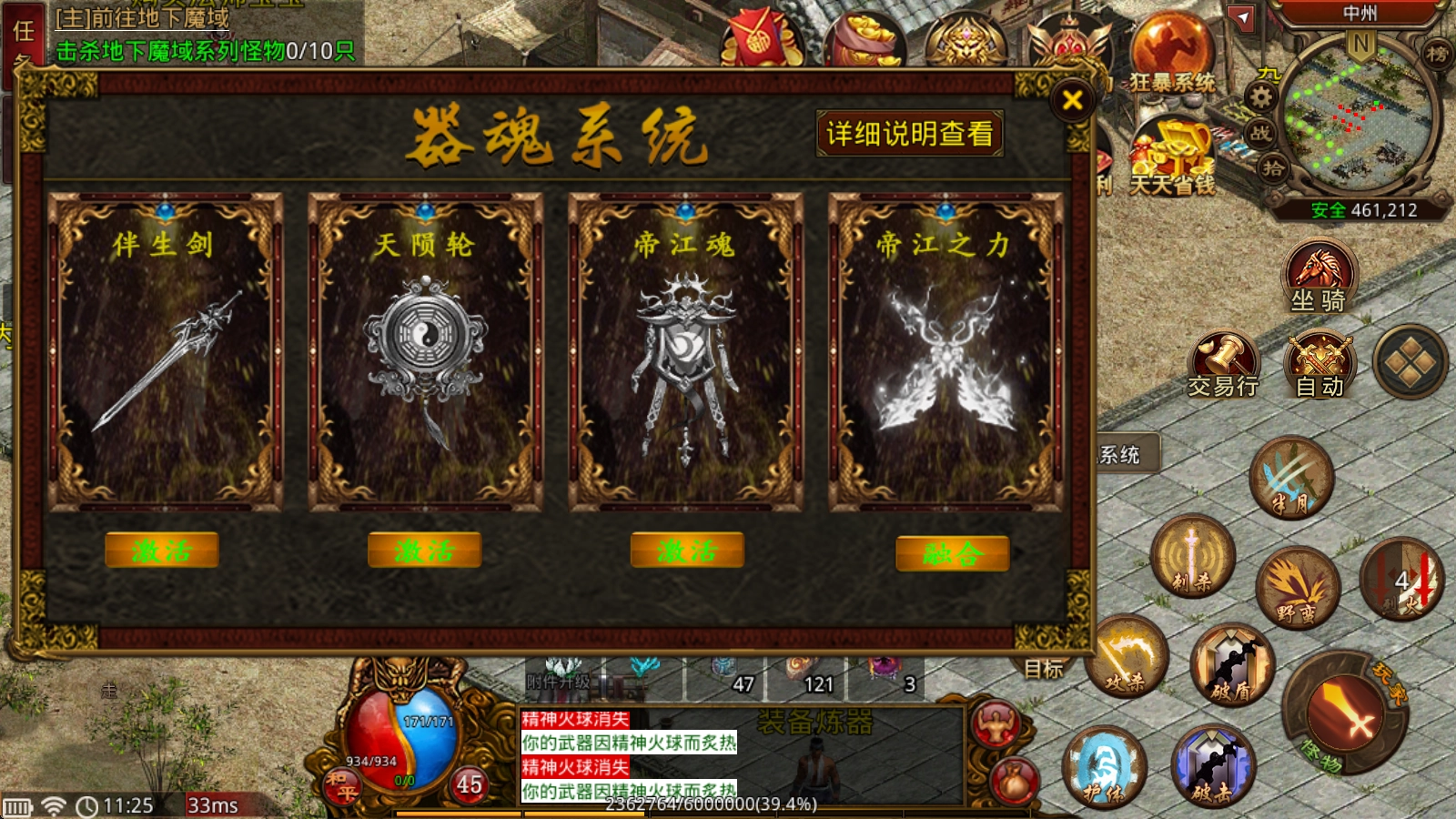器魂系统:激活器魂需要器魂激活符1个+50万金币,激活器魂后,可以进行升级,最高10级。每个角色只可以佩戴一种器魂,获得对应器魂属性加成。