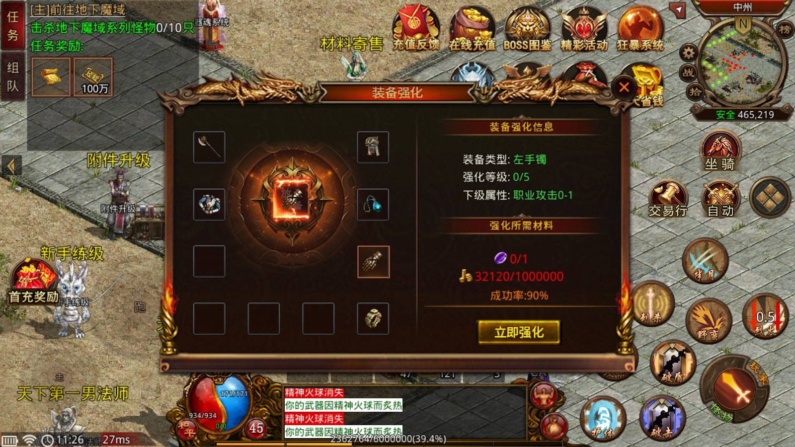 装备强化:对于身上所佩戴的装备,可以消耗强化石和金币对其进行强化,强化等级越高,成功率就会越低。