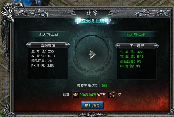 境界系统的核心功能是大幅强化玩家的生命值、攻击、魔法、道术等核心属性。玩家既可以前往盟重地图的特定NPC处完成境界晋升,也能直接通过系统界面进行升阶操作。提升境界的关键道具为境界卷轴,获取途径包括参与战斗、挂机挑战副本等;若拥有多余的卷轴,还可通过合成机制进一步解锁更高层级的境界。