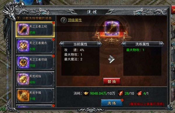 洗练系统:此系统能够优化角色的属性与技能,借助洗练来改良装备属性,进而增强战斗力。玩家可在功能栏里找到洗练选项,对装备开展操作。洗练过程需要消耗洗练石,要是针对配饰的话,还得用到星王结晶。需要留意的是,只有魔龙级以及更高等级的装备才允许进行洗练操作。