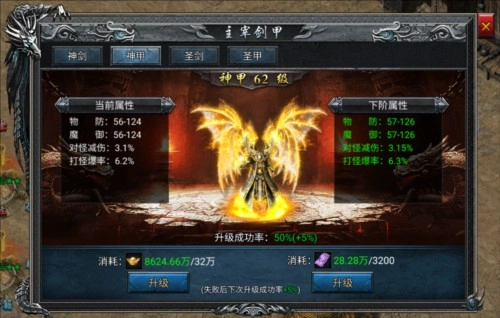 幻武、幻甲与斗气能够借助升级进一步增强各项属性;幻武和幻甲的升级需消耗时装碎片,而时装碎片可通过击败BOSS获取;斗气则要消耗对应的斗气材料来完成升级。