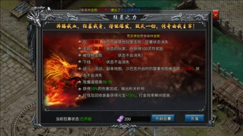在战斗、活动、副本地图以及沙巴克开启时的盟重地图中被击败(狂暴)状态不会消失。