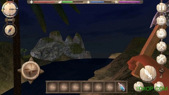 二是采摘水果:点击树木或灌木,长按手形按钮,即可获得浆果、香蕉以及叶子等其他物品。获取水源的方法: 在岛屿中央地带分布着淡水池塘,你只需进入水中,然后点击快捷栏里的水瓶,就能将其装满淡水了。