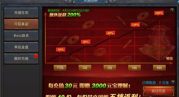新区的活动十分丰富,其中福利最丰厚的要数基金和轮盘了。基金活动的规则是,大家每充值30元就能获赠一份基金,最多可以获得40份。之后随着等级提升到相应阶段,就能领取对应的元宝奖励。当等级达到8转时,累计可获得200%的奖励,而40份基金总共能带来24万元宝的收益。