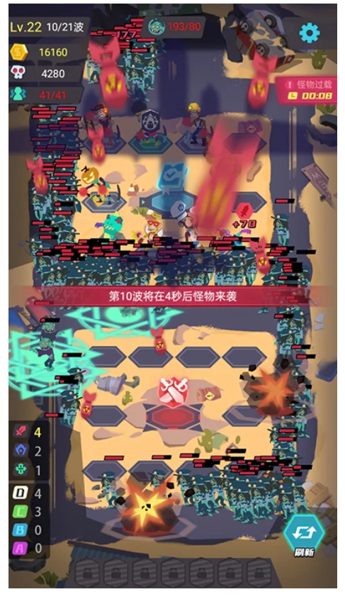 ★循环圈关卡:1/怪物一直在场地中循环移动,如果怪物存活数量超出承载上限15s,则游戏失败,2/最后boss出现,则需在1min内消灭所有怪物。