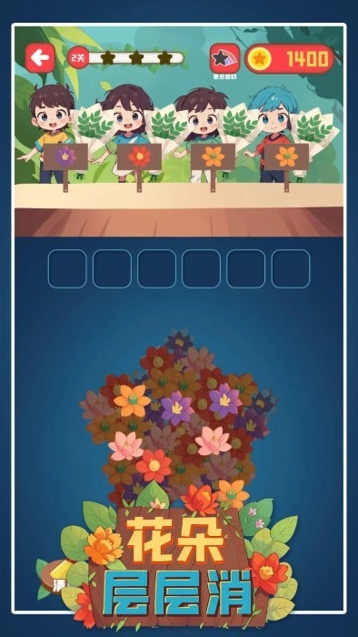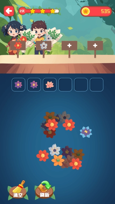 游戏的第一关难度不高,只要点击三朵颜色各异的花朵,它们就会被送到角色手中,随后消除并离开。