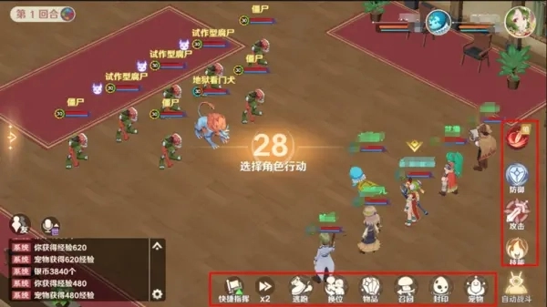 横排菜单: 快捷指挥(可自行编辑指令并下达,在组队挑战副本时作用尤为关键),战斗进程倍数(最大可调整至三倍速),逃跑(主角发起逃跑有几率成功;组队场景中,单人逃跑会脱离队伍,全队共同逃跑则能成功撤离),换位(实现宠物与主角的前后位置调换),物品(使用各类药水,可对目标进行加血、加蓝或复活操作),召回(将出战宠物收回),封印(使用封印卡捕捉1级宠物宝宝,需注意要为自己的宠物设置防御作战指令),宠物(从背包中挑选其他宠物替换当前出战宠物)