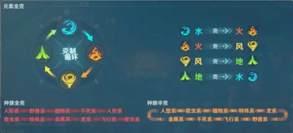 我们的克制类型可分为三类:元素全克制、种族全克制以及种族半克制。