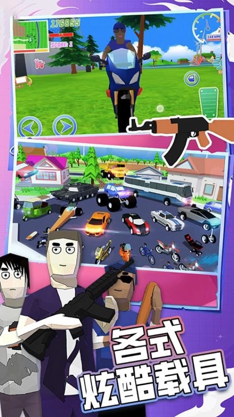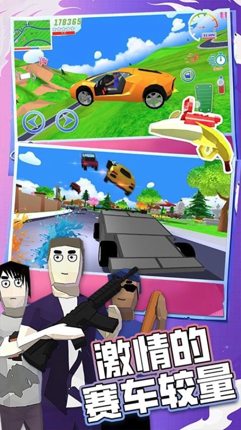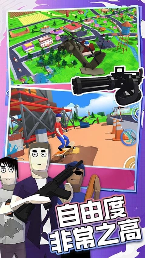 这是一款超好玩、自由度超高的沙盒开放世界射击游戏,主打无厘头搞怪的沙雕风格!你可以在城镇里驾车兜风,在公园和田野间漫步,还能体验漂流的乐趣,探索那些别具特色的美丽建筑。