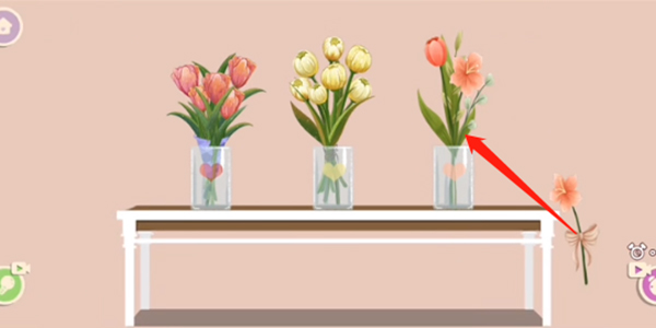 这是第一关,也是最容易通过的关卡。玩家首先要将左边那朵带叶子的红色花,以及右边三朵簇拥在一起的花,一同放进左边的花瓶里;接着把左边的黄色花和右边数量较多的那簇黄色花,放入中间的花瓶中;最后将右边剩下的浅红色花放置到右边的花瓶里,这样就能完成关卡了。