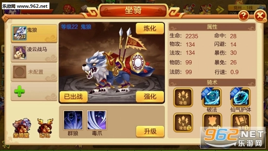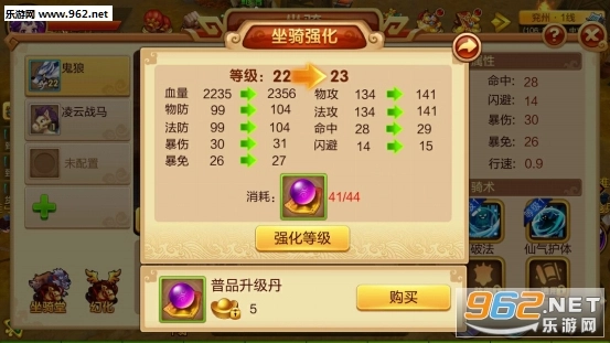每个坐骑都自带额外的附加属性,选择该坐骑出战,能显著助力角色属性的提升。坐骑支持强化操作,强化后其属性会相应提高。强化坐骑需消耗普品升级丹,每提升10级会迎来一次进阶突破。