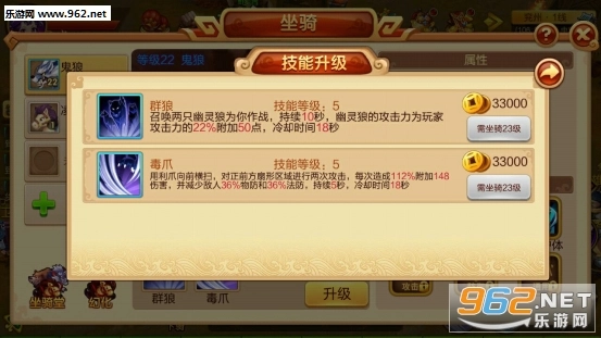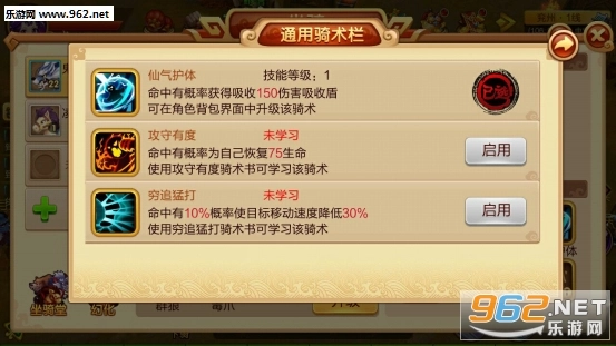 每个坐骑天生自带两个技能,技能也能升级。不同坐骑自带的技能各有差异,且自带技能无法替换。