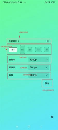 3、可以设置项目名称、宽高比例、分辨率、帧速率、背景颜色;