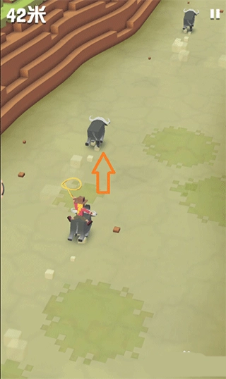 1、开玩画面中,人物会骑驾着小野牛,带着套索在地面上奔跑,按着画面不松开,在距前方的动物较近时,向前一滑,瞬间跳入。