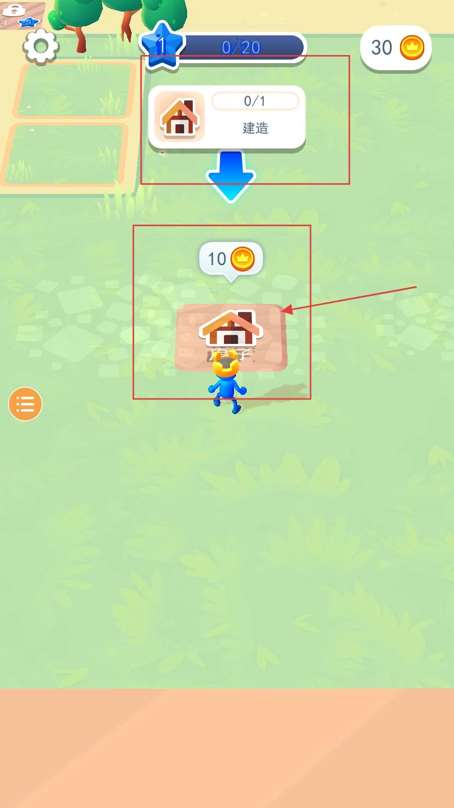 玩家进入后,需点击对应的建造房屋标识,消耗10金币,在指定区域搭建房屋,以此完成建造任务。