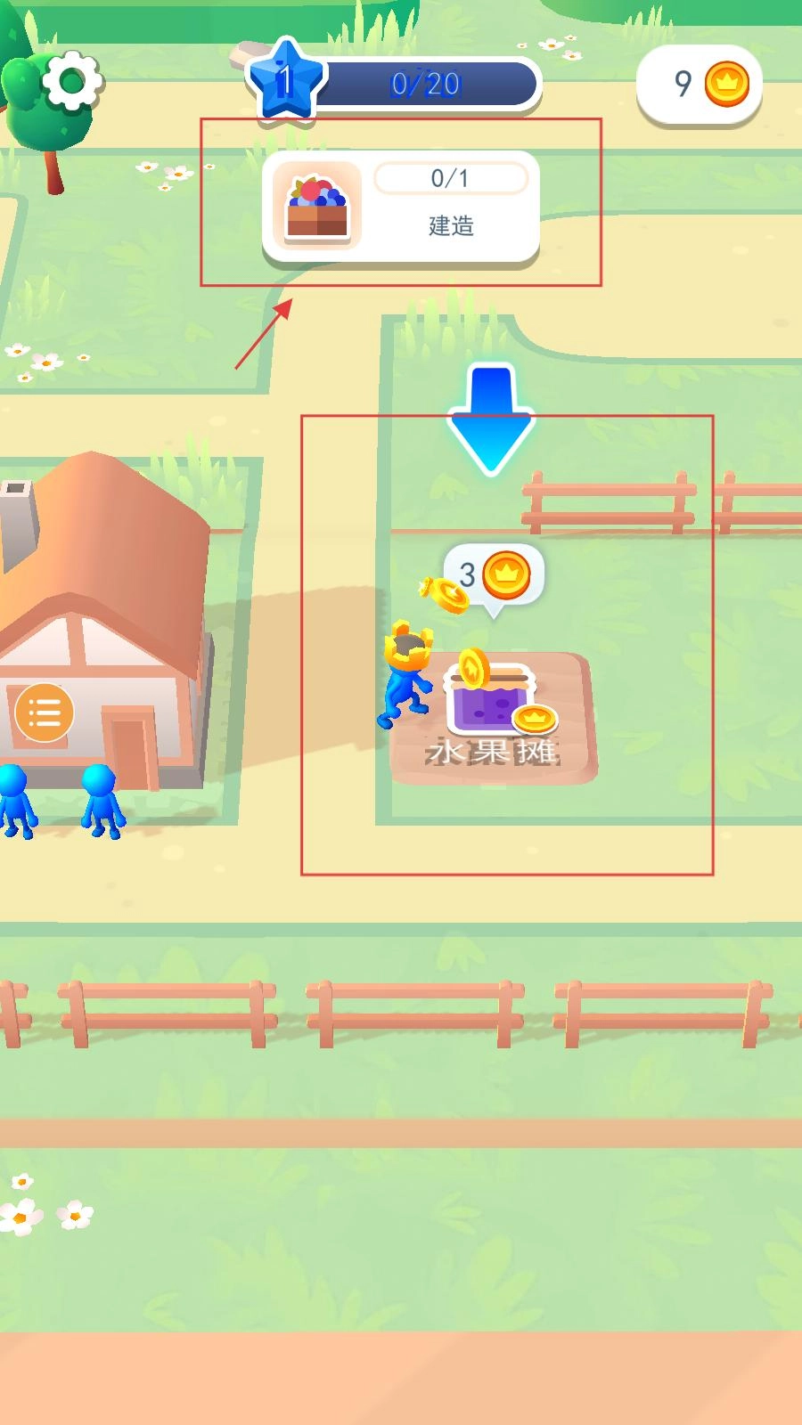 玩家还能前往水果摊的建造地点,花费3枚金币来建造水果摊,这样就能获得金币收益,同时推动建造的进度。