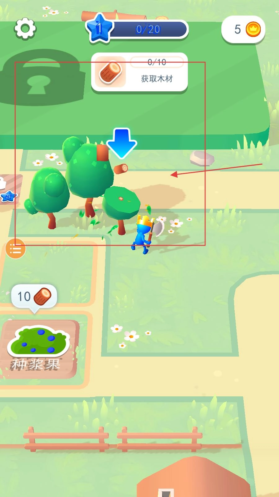 玩家在领取获取木材的任务后,需操控角色砍伐树木,收集10根木材,以此达成资源收集的目标。