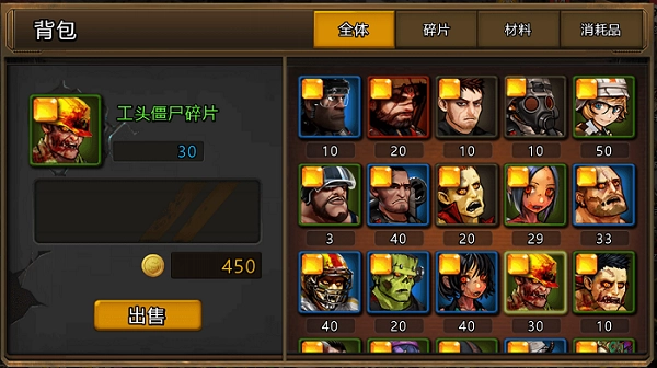 全体:顾名思义,在这个分类下能查看背包里的所有物品,涵盖碎片、材料和消耗品。