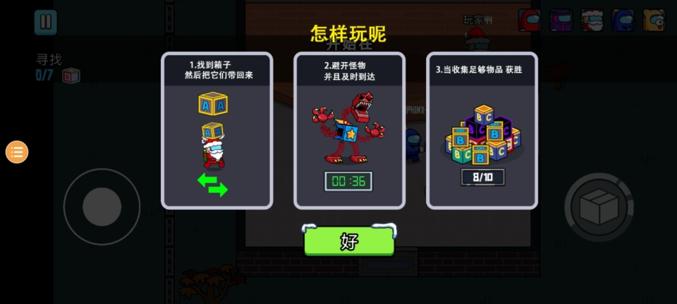 找到盒子并把它们带回来,避开怪物,及时抵达,当收集到足够的物品时就能获得胜利啦!