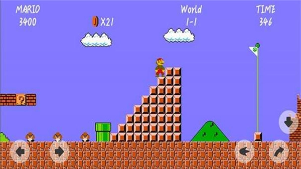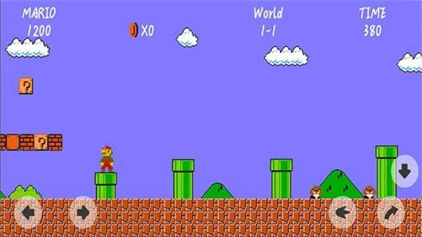 超级玛丽完整保留了其原始风格。屏幕左下方的按钮用于控制方向,右下角的按钮则负责射击与跳跃。