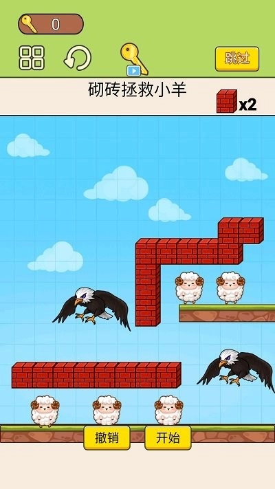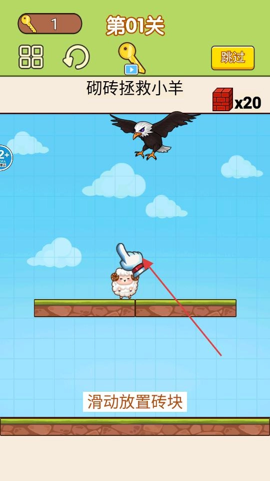 进入第01关场景后,按照提示滑动屏幕来放置砖块,在小羊的上方或周围巧妙地铺砌砖块,以此阻挡老鹰的袭击,确保小羊能安全通过这一关卡。