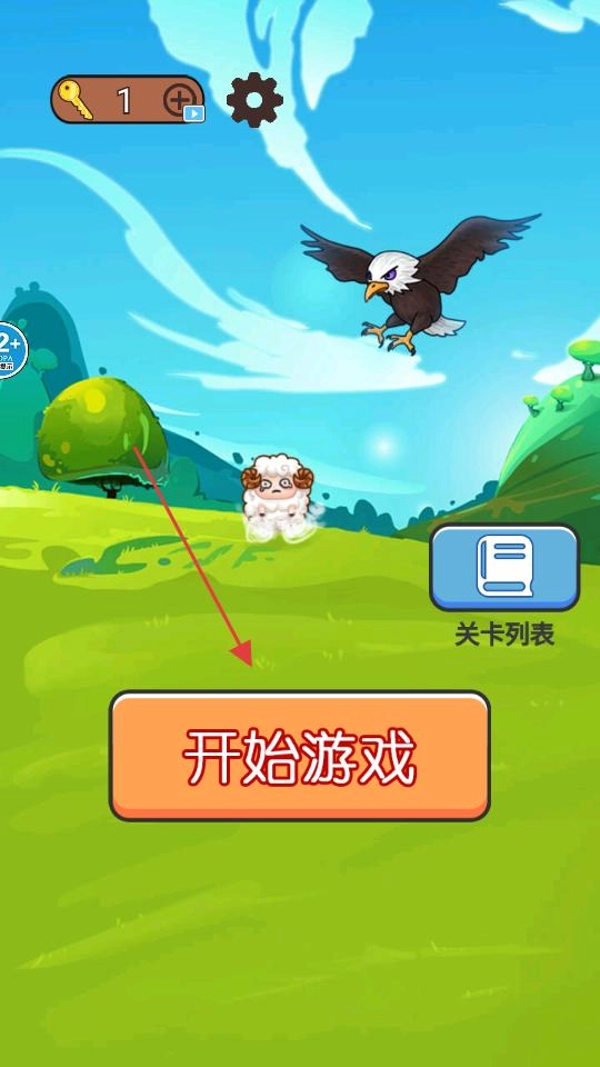 回到主场景后,找到小羊和老鹰,点击界面下方的橙色“开始游戏”按钮,即可进入关卡选择界面或直接启动第一关,正式开启拯救小羊的冒险之旅。