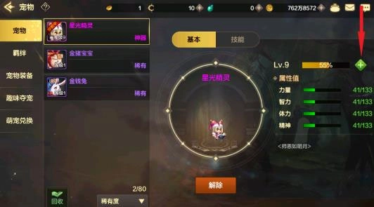 宠物能够为玩家带来额外的属性加成,就像图中的星光精灵能给角色增加力量、智力、体力和精神属性一样。当宠物升级时,它赋予角色的这些属性也会随之提升,具体表现为力量、智力、体力、精神的数值增加。不过需要注意的是,每个宠物的属性加成存在上限,比如图里的宠物在达到满级状态后,最多只能为角色提供133点的力量、智力、体力和精神属性。