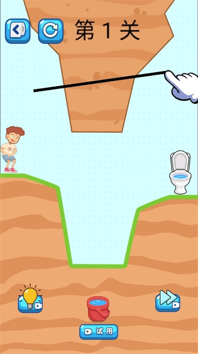 这款游戏融合了画线机制,玩家通过滑动屏幕向任意方向绘制线条,结合不同的场景设定,用线条切割各类物品,助力主角成功抵达厕所——主角到达厕所即意味着挑战完成。游戏内提供了多种道具,既能借助道具获取提示,也能直接跳过当前目标任务,解锁后续关卡剧情,供玩家体验探索。