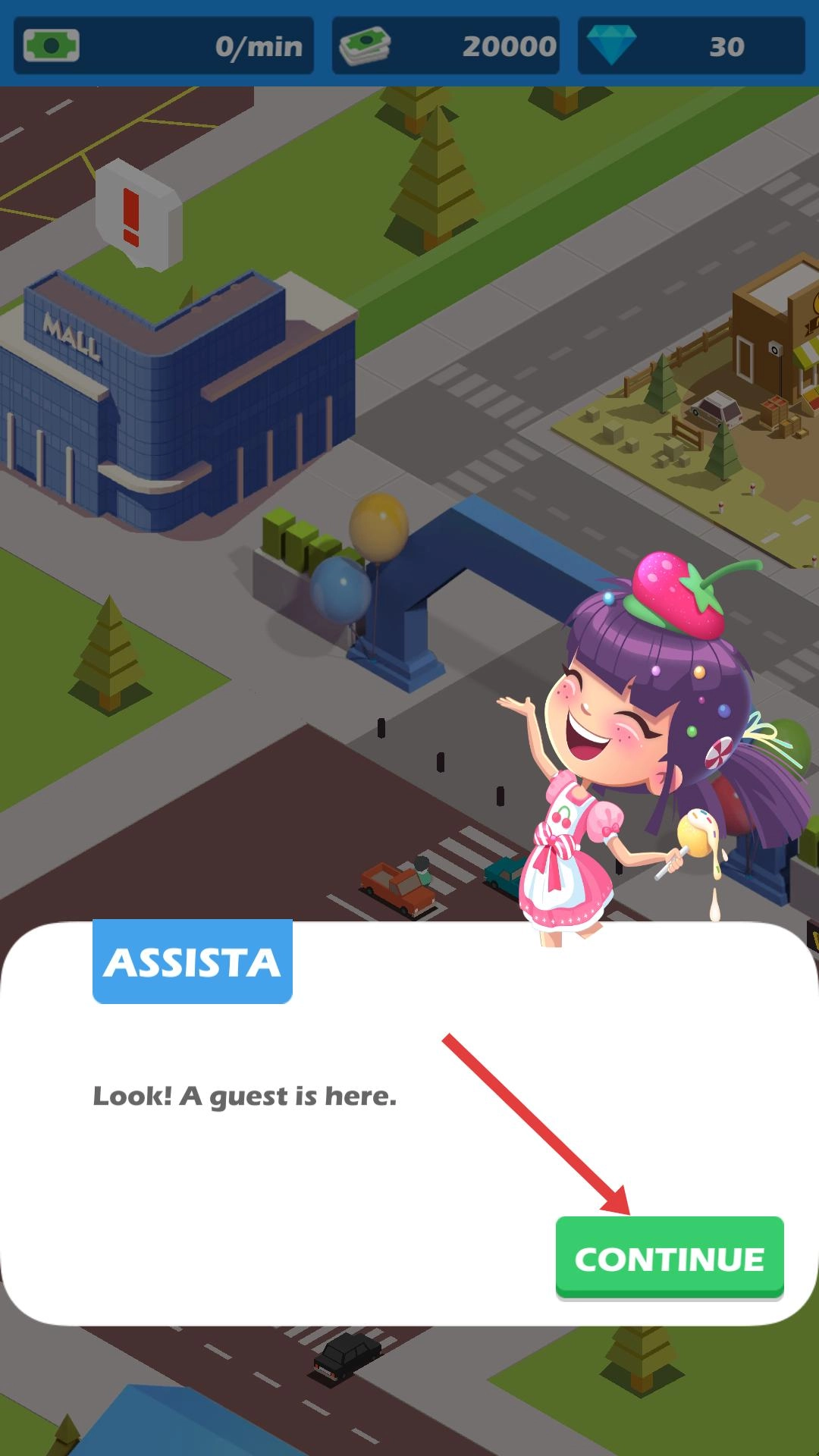 点击CONTINUE按钮,确认客人已抵达,启动互动环节,按照指引完成客人相关事务的处理,推动游戏流程向前进展。