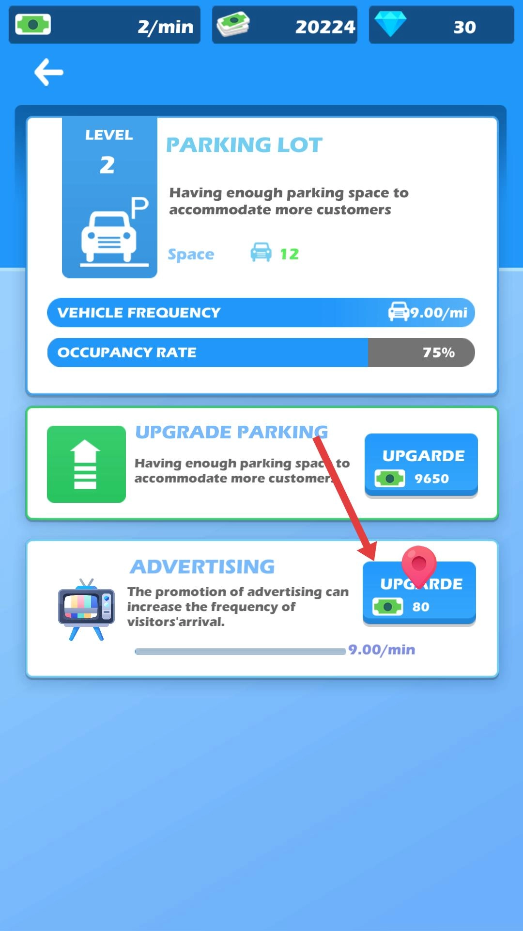进入停车场界面后,点击广告栏上的“UPGRADE”按钮,花费80货币对广告进行升级,这样可以提升访客的到访频率,从而为后续发展提供助力。