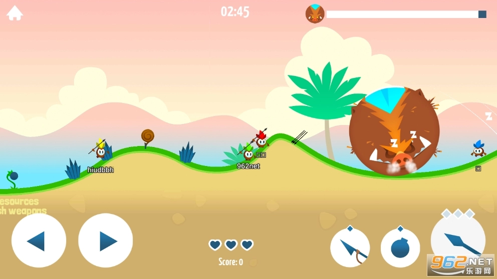 《Tiny Hunters安卓版》是一款横版卡通可爱风格的休闲竞技游戏,玩家在游戏中化身为体型迷你的小人,与另外两名玩家组队协作,借助投矛、炸弹和绳索矛三类武器,共同击退怪物以获取胜利。每位玩家初始拥有三条生命,游戏过程中需巧妙寻找有利站位,灵活躲避怪物来回滚动发起的攻击。