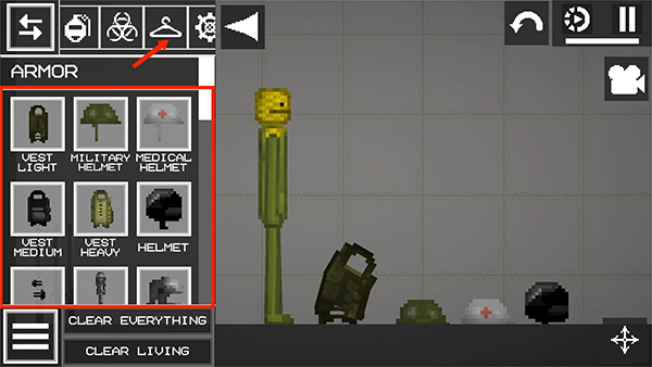 选择【衣架】图标,这里面包含了防弹衣、安全帽、头盔等多种不同类型的防护装备。