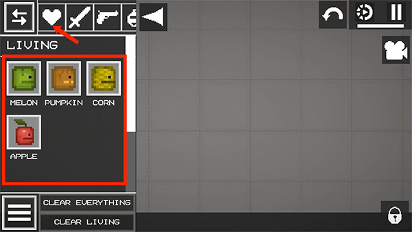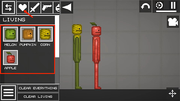 选择【爱心】图标,里面包含西瓜人、南瓜人、玉米人和西瓜人这四位角色,只需拖动他们就能把他们放置到地面上。