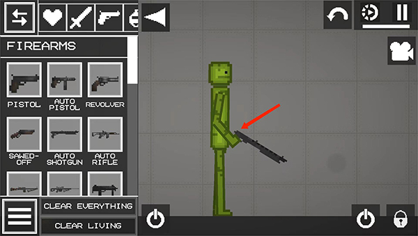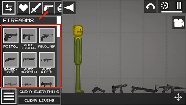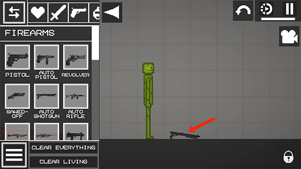 接下来,我们在菜单界面找到【枪】的图标并点击选择,然后挑选一把枪拖动到地面上。