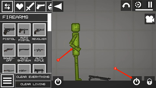 如图所示,能看到西瓜人物手中已经握着枪了,点击按钮就能开展射击操作,以上便是教大家让人物持枪的教程内容。