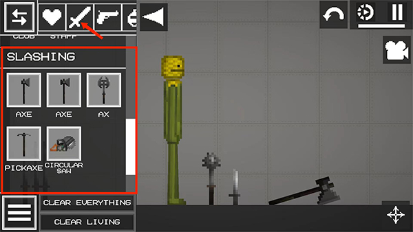 选择【宝剑】图标,其中包含宝剑、锤子、斧头等冷兵器可供选用。