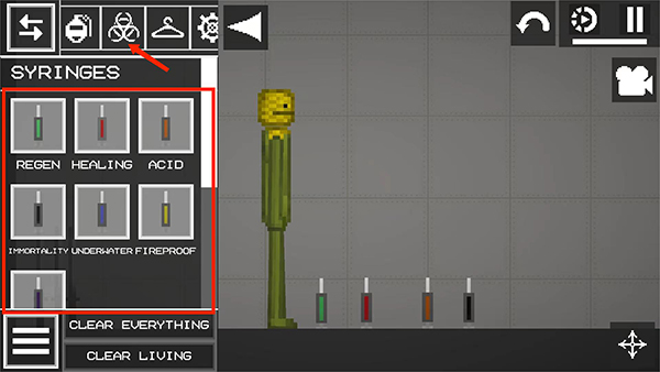 选择【生化】图标,其中包含有着不同颜色、属性与功能的各类药剂。