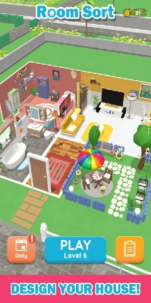room sort中文版,中文名为“房间排序”,是一款休闲益智类的拼图与放置游戏。该游戏的背景设定在一个虚拟世界里,这里的房屋设计均以七巧板的组合形式呈现,每个单元的布局都由多个造型各异的房间构成,玩家需要发挥自身的设计能力。