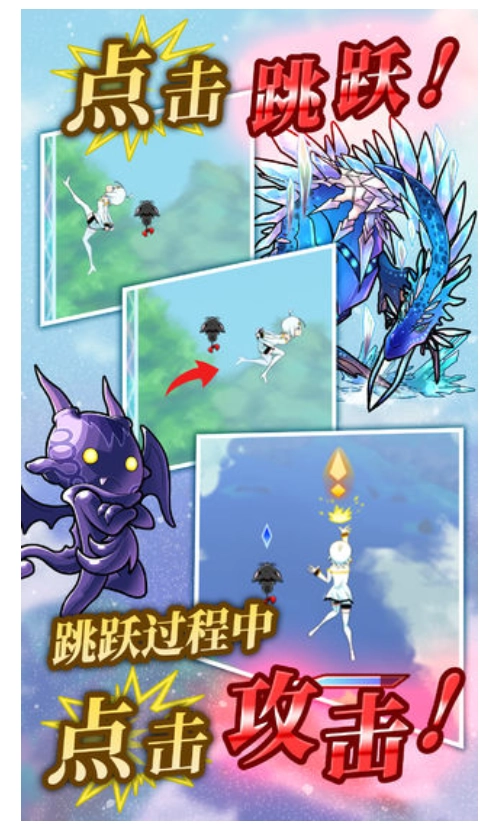 1、操作十分简单,只需点击就能轻松完成跳跃、躲避危险;玩家还能收集角色共同闯关,解锁各种漂亮角色,组建强大队伍展开冒险,击败所有怪物并获取游戏奖励,助力顺利通关。