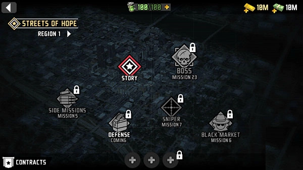 进入《最后的希望3》后,界面右侧的红色按钮用于显示任务提示,右上角则会展示金币和钞票的数量。