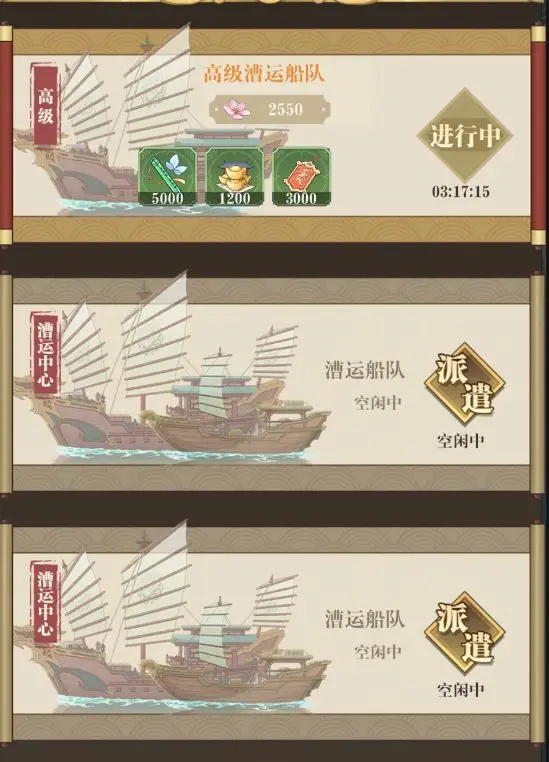 当船队处于空闲状态时,可安排其执行商会漕运任务;船队划分为初级、中级、高级三个类别,不同类别的船队带来的收益存在差异,等级越高的船队,漕运所获奖励越为丰厚;初级船队支持免费派遣,而中级和高级船队的派遣则需消耗相应的道具;每支参与漕运的船队都要委任5名知己,每位知己每周拥有2次免费的漕运委任机会,消耗元宝能够获取额外的委任次数,但元宝的消耗数量会逐步递增;每周一0点会对所有知己的漕运派遣次数进行重置。