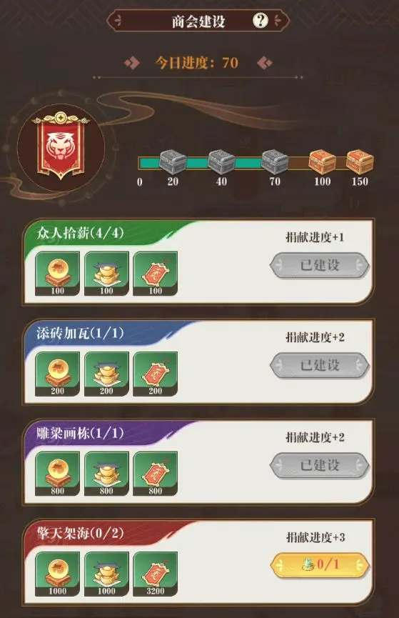 成员能够用个人贡献在兑换商店里换取稀有物品,个人贡献可以通过商会建设、商会漕运、商会商路等玩法获取。商会建设包含四种不同类型:初级建设、中级建设、高级建设、道具建设。每天0点会重置建设次数,当全体建设达到特定进度后,商会所有成员都能领取进度奖励,每天0点也会重置进度和奖励。