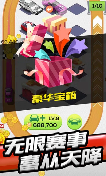 合并两辆等级相同的赛车,就能解锁更高级别的赛车;这里有海量赛车模型,每一辆都独具特色,让每一次合并操作都充满惊喜。